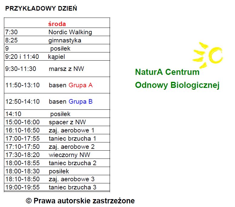 Jako jedyni w Polsce nasze zajęcia prowadzimy codziennie, przez cały rok, także w soboty, niedzielę i święta od godziny 7:30 do godziny 20.00. W programie czeka na Ciebie m.in.:Nordic Walking każdego dnia, nauka tańca brzucha, latinodance, joga, aqua-aerobik i przeróżne zajęcia aerobowe, gimnastyka, spacery i marsze, zajęcia body & mind, wędrówki i wycieczki z przewodnikiem oraz zabiegi SPA oparte na luksusowychn liniach kosmetycznych w bardzo przystępnych cenach.
